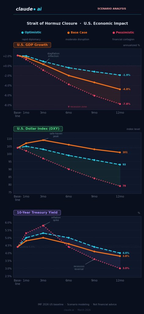 The US and world economies will soon begin experiencing inflationary headwinds driven by the Iran war and the resulting surge in crude oil prices. The AI generated graphic below illustrates the closure of the Strait of Hormuz’s impact over time on US GDP, the Dollar and the yield on the US 10 Year Treasury.